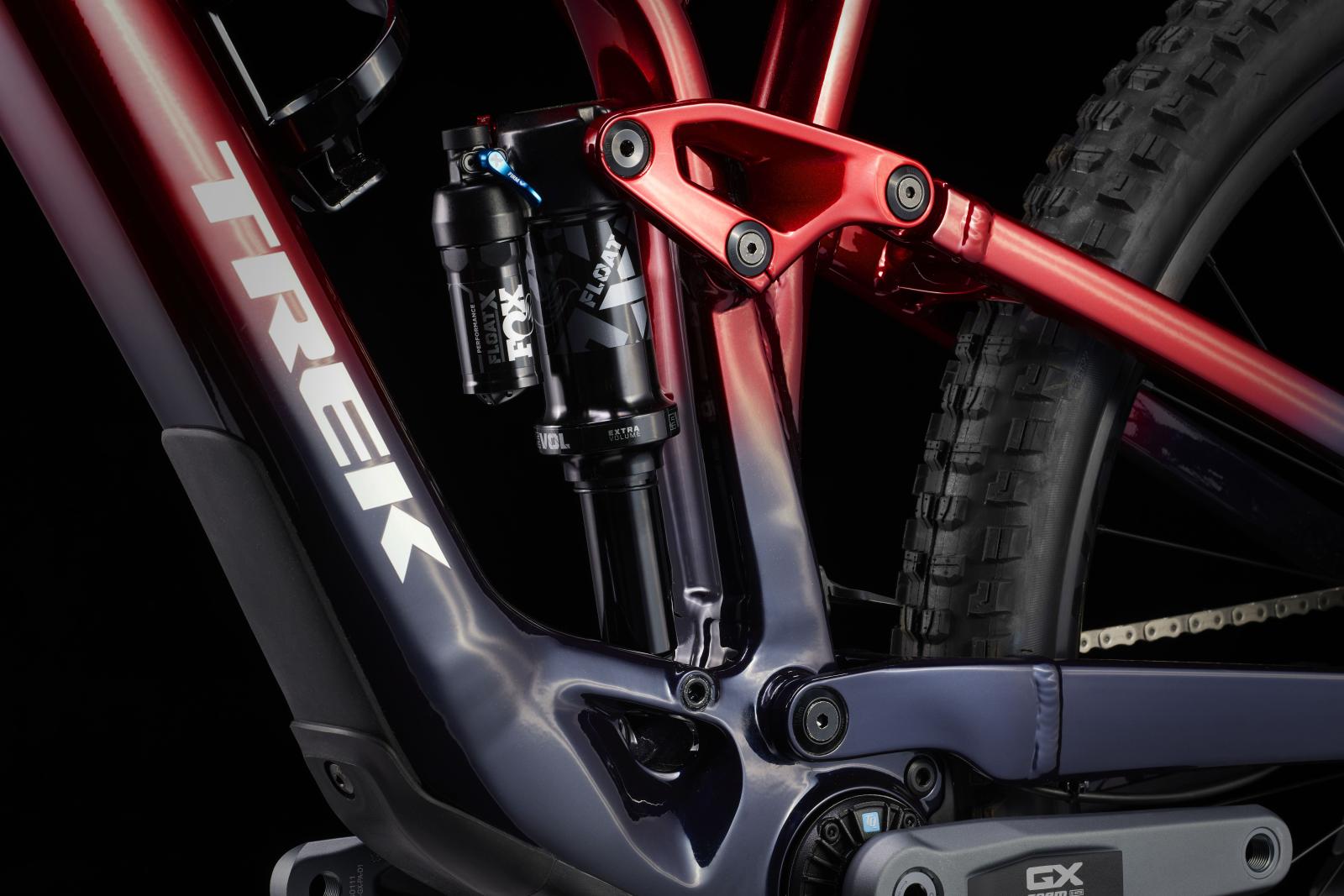 Einen Rahmen aus Alpha Platinum Aluminium mit TQ HPR50 Harmonic Pin-Ring Getriebe mit komplett im Rahmen verbautem, herausnehmbarem 360-Wh-Akku samt smartem Ladeanschluss. Gleichzeitig sorgen ein integriertes LED-Display und eine lenkermontierte Fernbedienung f�r intuitive Benutzungsfreundlichkeit, w�hrend eine FOX Rhythm 36 Gabel mit 150 mm Federweg, Float EVOL Luftfederung und GRIP-D�mpfung und ein FOX Performance Float X Hinterbaud�mpfer mit 140 mm Federweg ein hochleistungsf�higes Fahrwerk bilden. Breite Bontrager Line Comp 30 Tubeless-Ready-Laufr�der, SRAMs drahtlose GX AXS 12fach-Transmission, hydraulische Scheibenbremsen